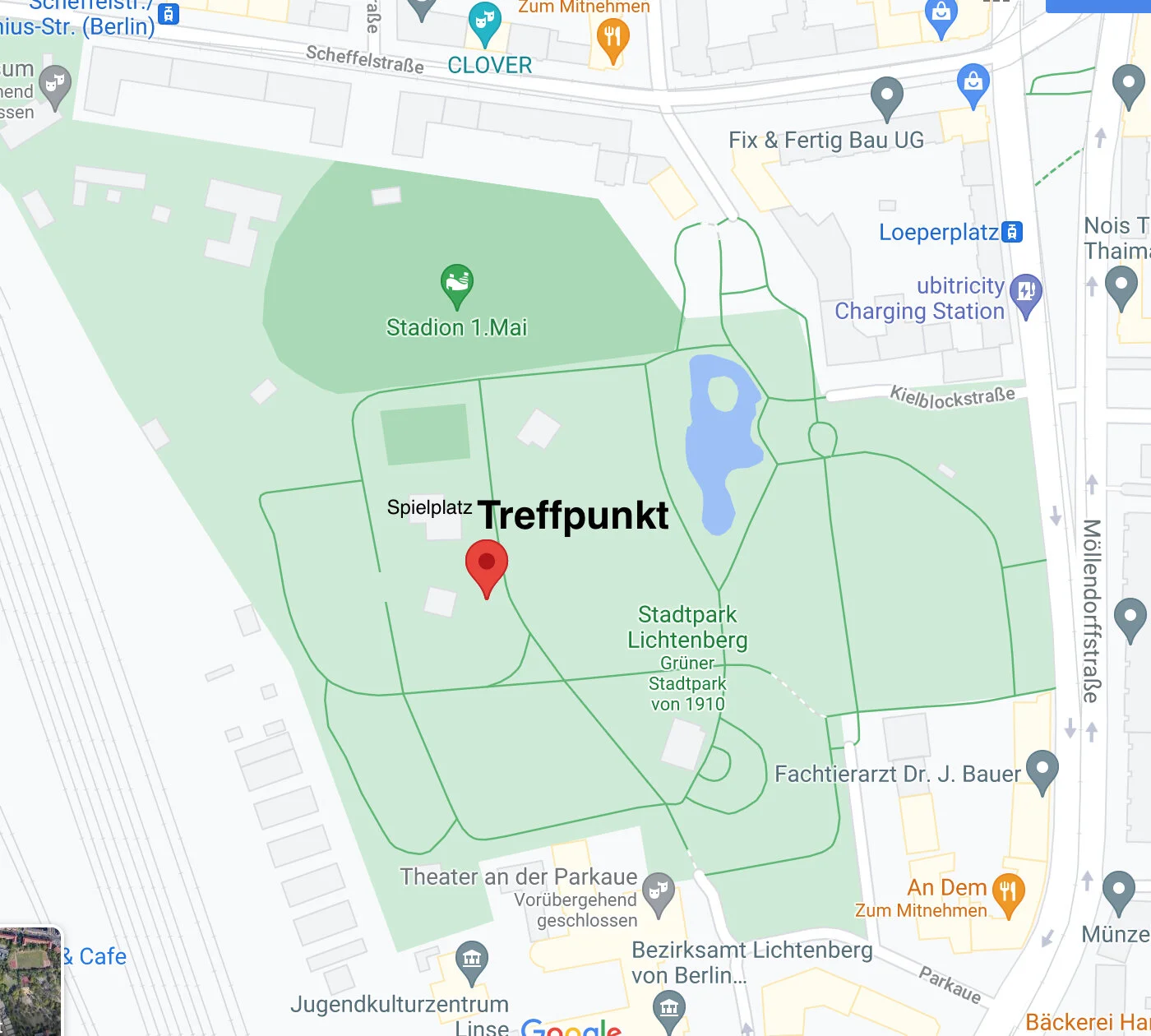 Treffpunkt: Im Stadtpark Lichtenberg, direkt südlich des neuen Spielplatzes. Google-Koordinaten: 52.51828, 13.47617